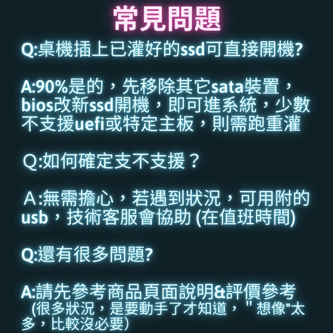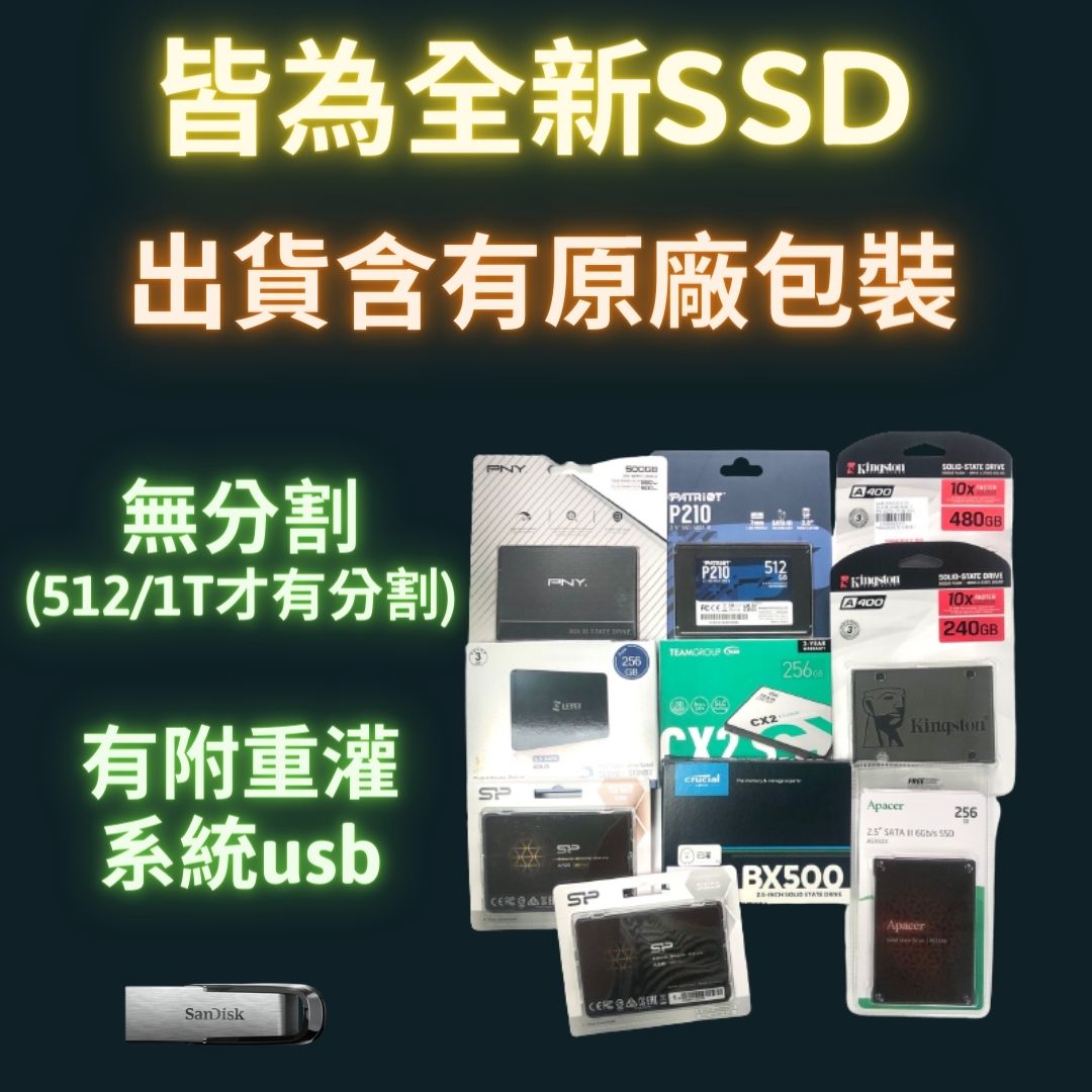 其它容量SSD,可以用附的usb 跑系統重灌 再用自己想法分割 (若有問題,客服可以協助)