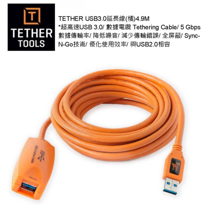 TETHER USB3.0延長線(橘)4.9M *超高速USB 3.0/ 數據電纜 Tethering Cable/ 5 Gbps 數據傳輸率/ 降低噪音/ 減少傳輸錯誤/ 全屏蔽/ Sync- N-Go技術/ 優化使用效率/ 與USB2.0相容
