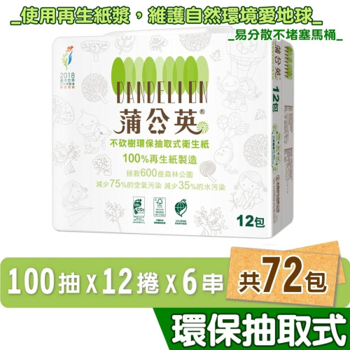 蒲公英 環保 抽取 衛生紙 100抽12包6串共72包入/箱購【【產品可投入馬桶,易溶不堵塞】宅購省 箱購宅免運