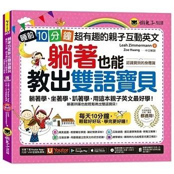 躺著哄睡也能輕鬆教出雙語寶貝! 躺著學、坐著學、趴著學, 用這本親子英文最好學! 美國父母都是這樣教小孩! 在台教學多年的美籍老師Leah Zimmermann 為台灣小朋友量身打造出最豐富、最專業的學習內容。 不只光碟,更附VRP虛擬點讀筆App隨掃隨聽, 由美籍老師搭配中文老師解說及錄音, 讓學習更輕鬆、無負擔! 只要你想得到,這本通通有! 不只有單字、句型、會話、故事, 甚至連美國小孩最愛的數來寶都有, 還有親子手冊可以參考使用,學習更有力! ★適用對象:所有新手父母和寶貝 ★適用年紀:各個年紀的新手父母和0~12歲的寶貝 │父母的救星來了! 同樣的故事總是聽不膩,這時不妨換換口味──用這本《躺著也能教出雙語寶貝:睡前10分鐘,超有趣的親子互動英文【認識寶貝的身體篇】》,陪寶貝度過一天中最幸福的時刻! │哄寶貝實在太累,總是被寶貝反哄睡嗎? 一起躺著聊天也能學英文!翻開本書,和寶貝一起認識人體的奧妙,不只學英文,還能學習認識自己、解答人體的十萬個為什麼,讓寶貝滿足的睡著! │最強外掛開起來! 使用時搭配親子手冊及VRP虛擬點讀筆,顛覆以往學習方式、無須再費力擺弄光碟機,用手機就能隨掃隨聽!親子手冊更收錄了書中的完整指示與補充說明,不用怕看不懂、被寶貝問倒! 【使用說明】 三大特色、六個重點,哄睡哄出雙語寶貝! 1.   由五感學習下手,用聽覺和視覺塑造雙語學習環境! 超精美插圖:視覺輔佐學習,讓記憶更深刻! 全彩插圖的圖像式學習,不只賞心悅目,更能幫助寶貝輕鬆在腦中建立起單字網。 雙聲道故事:用聽覺建立對英文的初步認識! 中文導入故事,再加入英文會話句穿插其中,讓寶貝對外語的初步學習沒有壓力,更快上手。 2.   就算父母英文不好,也能放心陪寶貝輕鬆學習! 陣容最專業:教學這種事,讓專業的來! 美籍老師Leah Zimmermann精心編制的學習內容,每個單元、甚至每個單字都是老師參考自身與孩子的學習經驗、及多年的教學經驗而設計,就像美國人說母語一樣自然學習。 內容最貼切:最貼心、最符合使用者需求! 每個中文字都有注音,可以讓寶貝自己閱讀;每個單元都有補充單字,讓寶貝能夠舉一反三;更有親子手冊可以讓父母參考引用,不怕被寶貝問倒,爸爸媽媽就是最棒的老師! 3.   輔助輕鬆小遊戲,讓寶貝快樂學習! 互動小遊戲:邊玩邊學無負擔,輕鬆又簡單! 必不可少的互動遊戲,將學習內容完整包覆,只要動動手就能複習單元內容。 內容最齊全:睡前時光也能愜意充實又精彩! 不只附有親子手冊能讓父母更輕鬆陪伴寶貝學習,更有VRP虛擬點讀筆可以掃描聆聽故事和音檔,一本就能掌握所有學習工具! 睡前10分鐘, 和寶貝躺在床上說故事的時光也能輕鬆學英文! │線上下載「Youtor App」(內含VRP虛擬點讀筆)