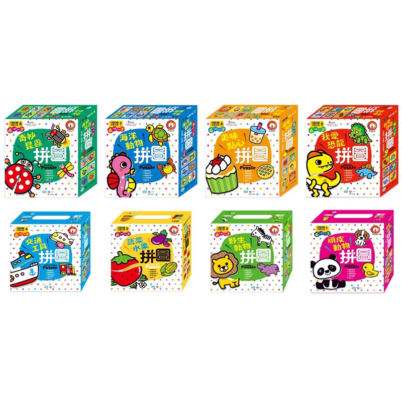 拼圖內容是幼兒日常活動中常接觸到的8大主題,如動物、水果、交通工具、昆蟲.....等;拼圖片數設計有3、4、5、6片,不同片數讓幼兒的拼圖遊戲更具有挑戰性;