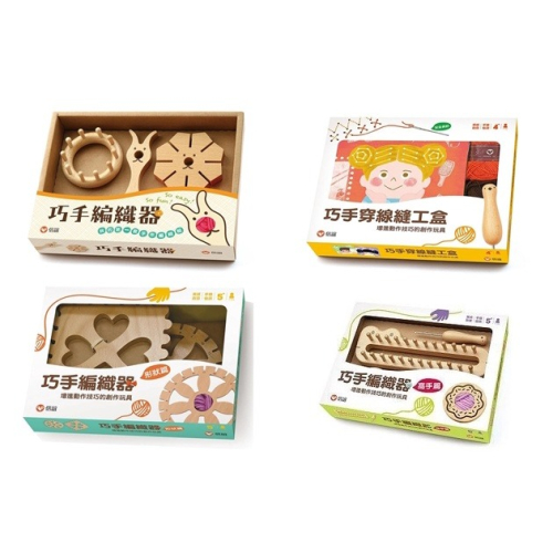 「巧手編織器」含有三種編織器,讓孩子有多樣的編織體驗。天然櫸木材質、可愛的動物造型,適合幼兒抓握。兔子編織器可以織成項鍊、手環、花,獅子編織器為手環編織器,透過簡單的規則就可以編出手環,圈圈編織器可以編出筒狀的作品,做出圍巾、花和針插等。