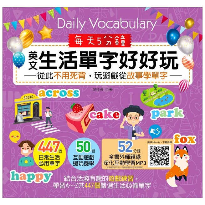 從日常小事、特殊節日、學校生活、到情緒表達,書中嚴選小朋友們生活中會出現、會用到的基礎英文單字,配上實用的例句及可愛的插圖,更有美籍外師專業親錄音檔,收錄在書中QR code,輕鬆一掃就能把專業名師隨身帶在身上陪你學英文!