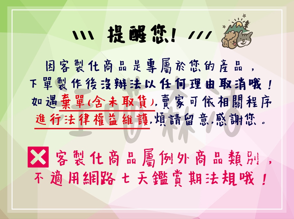 📣本商品為客製化商品,不適用消費者保護法第十九條七日猶豫期間規定,請確認後再下單購買