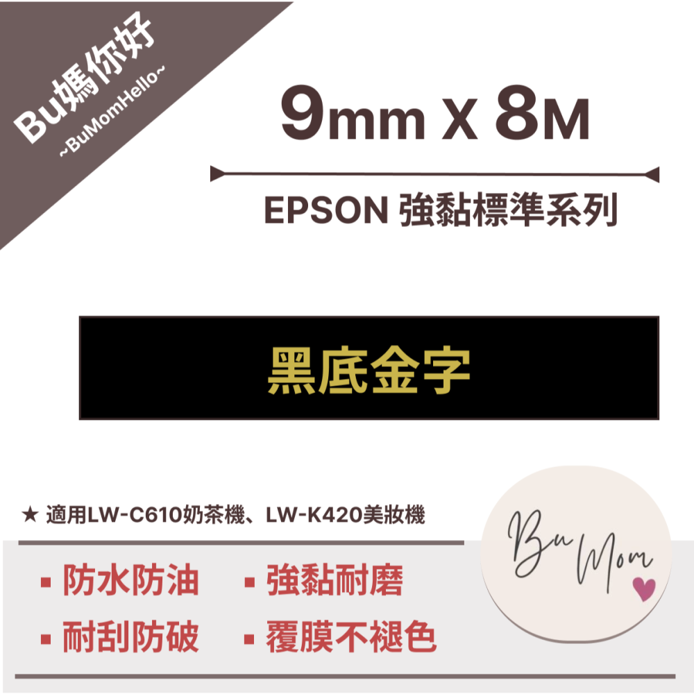 【EPSON相容標籤帶】★強黏標準★ 黑底金字9mm (適用LW-C610奶茶機、LW-K420美妝機)