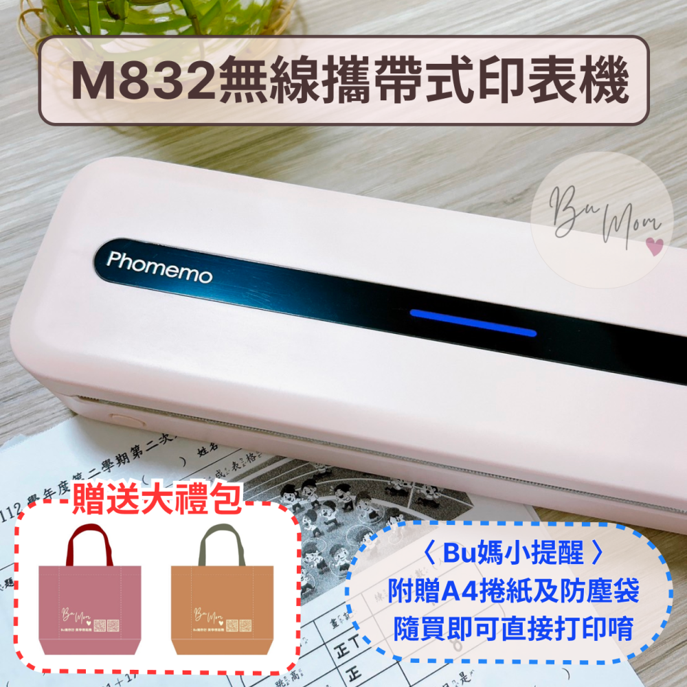 購機套組:內含M832升級版熱感式印表機、內含A4捲紙一捲、專屬防塵袋一個。