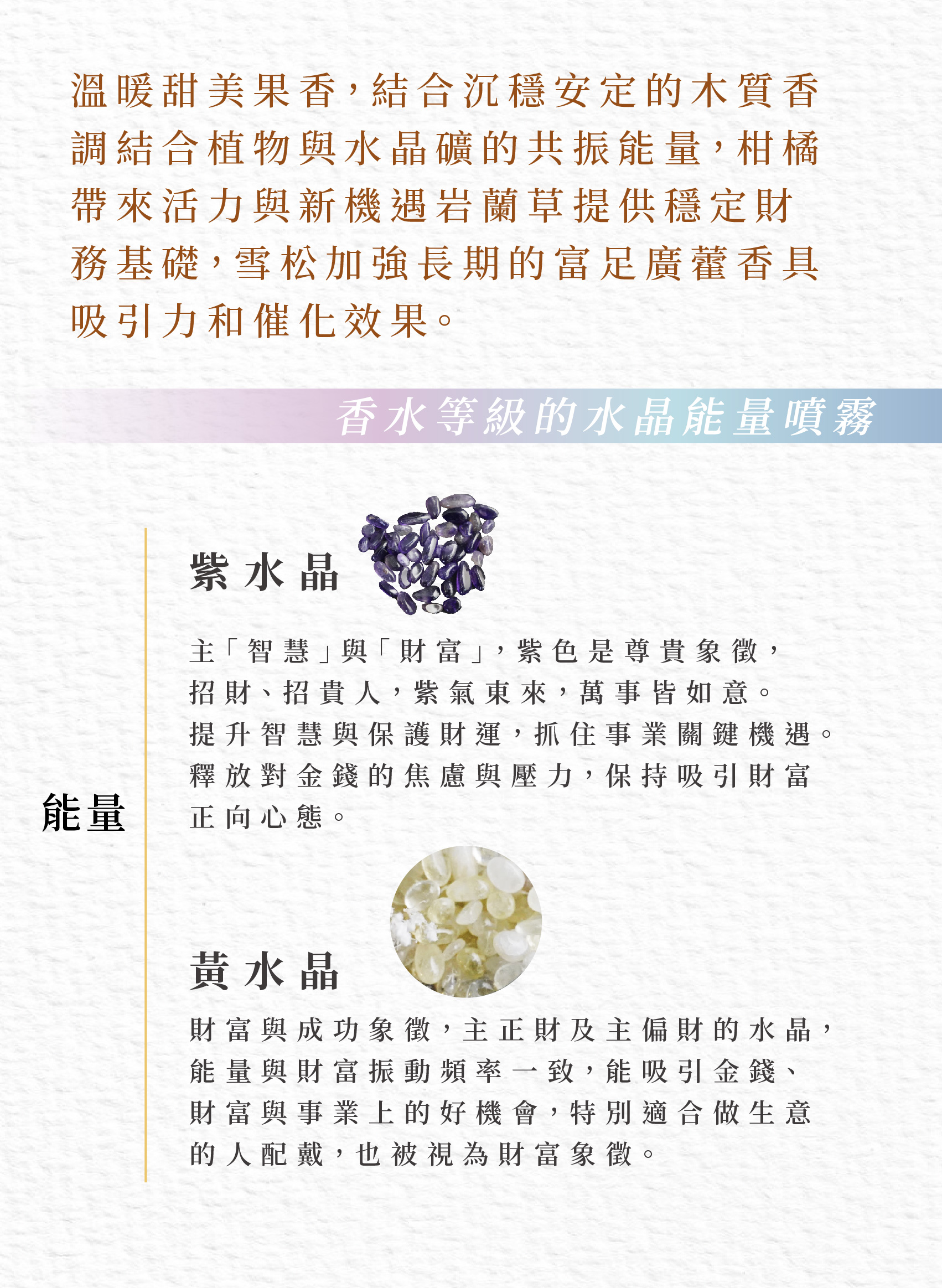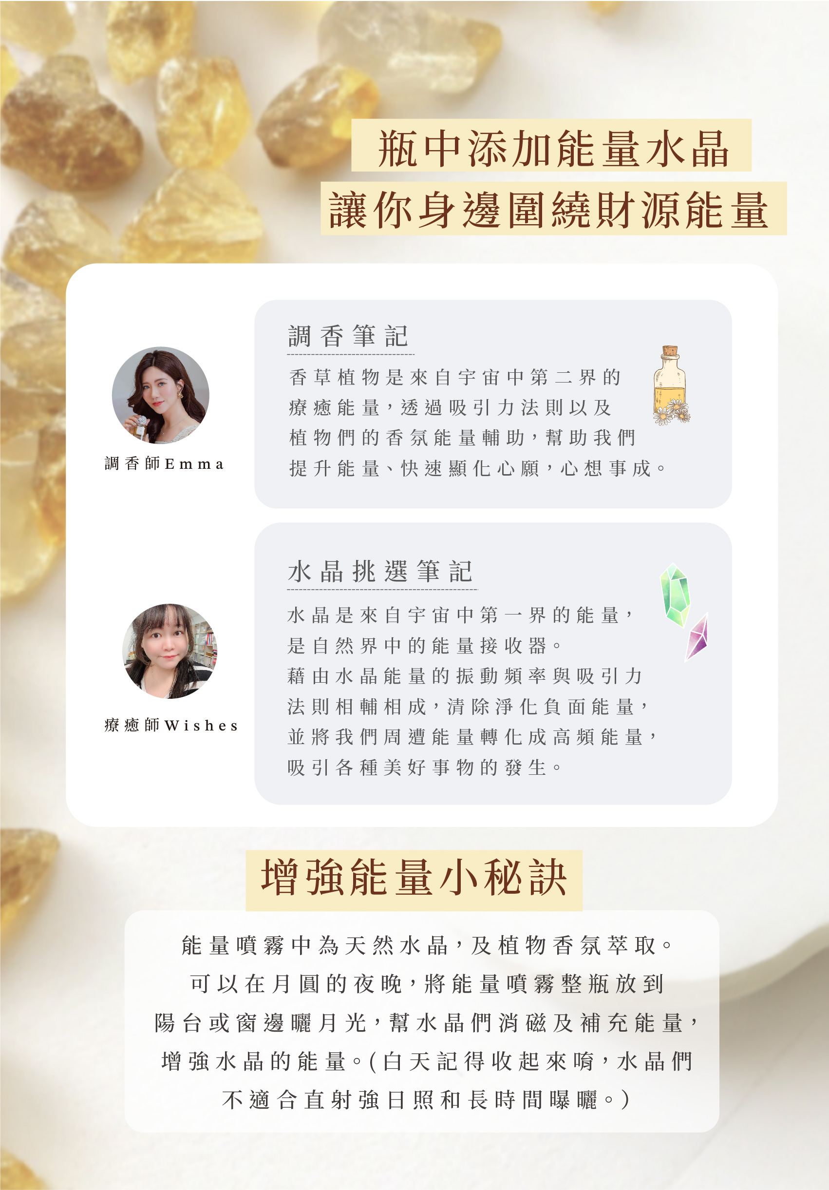 能量噴霧中為天然水晶,及植物香氛萃取。