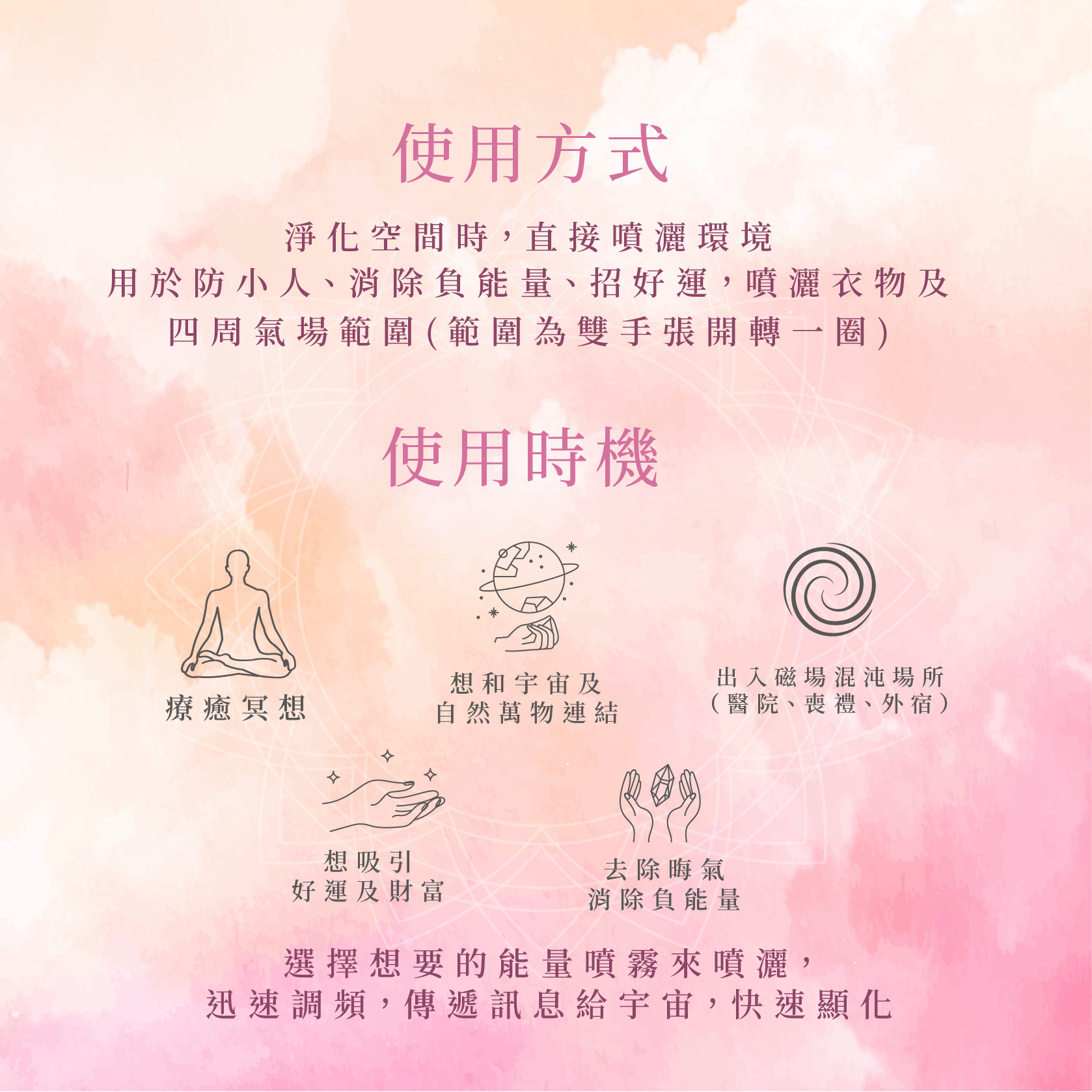 ◇隨時隨地想與宇宙及大自然萬物做連結時皆可噴灑。