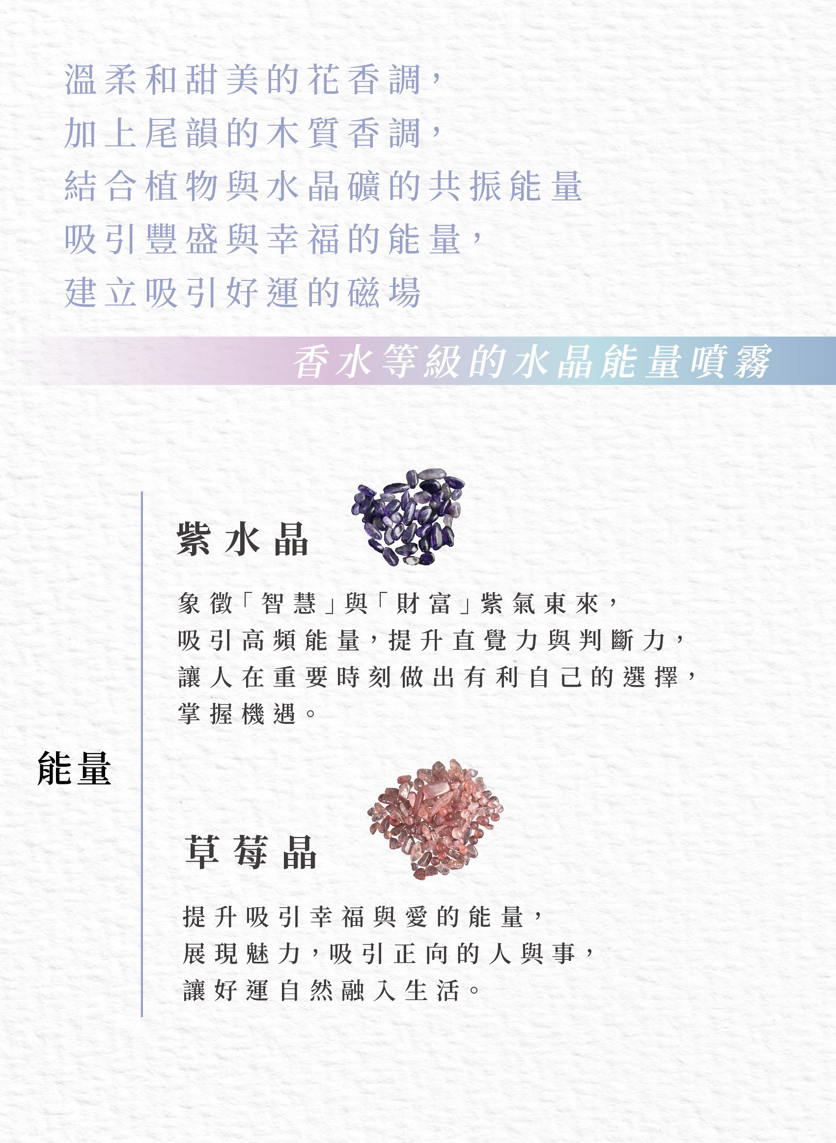能量噴霧中為天然水晶,及植物香氛萃取。