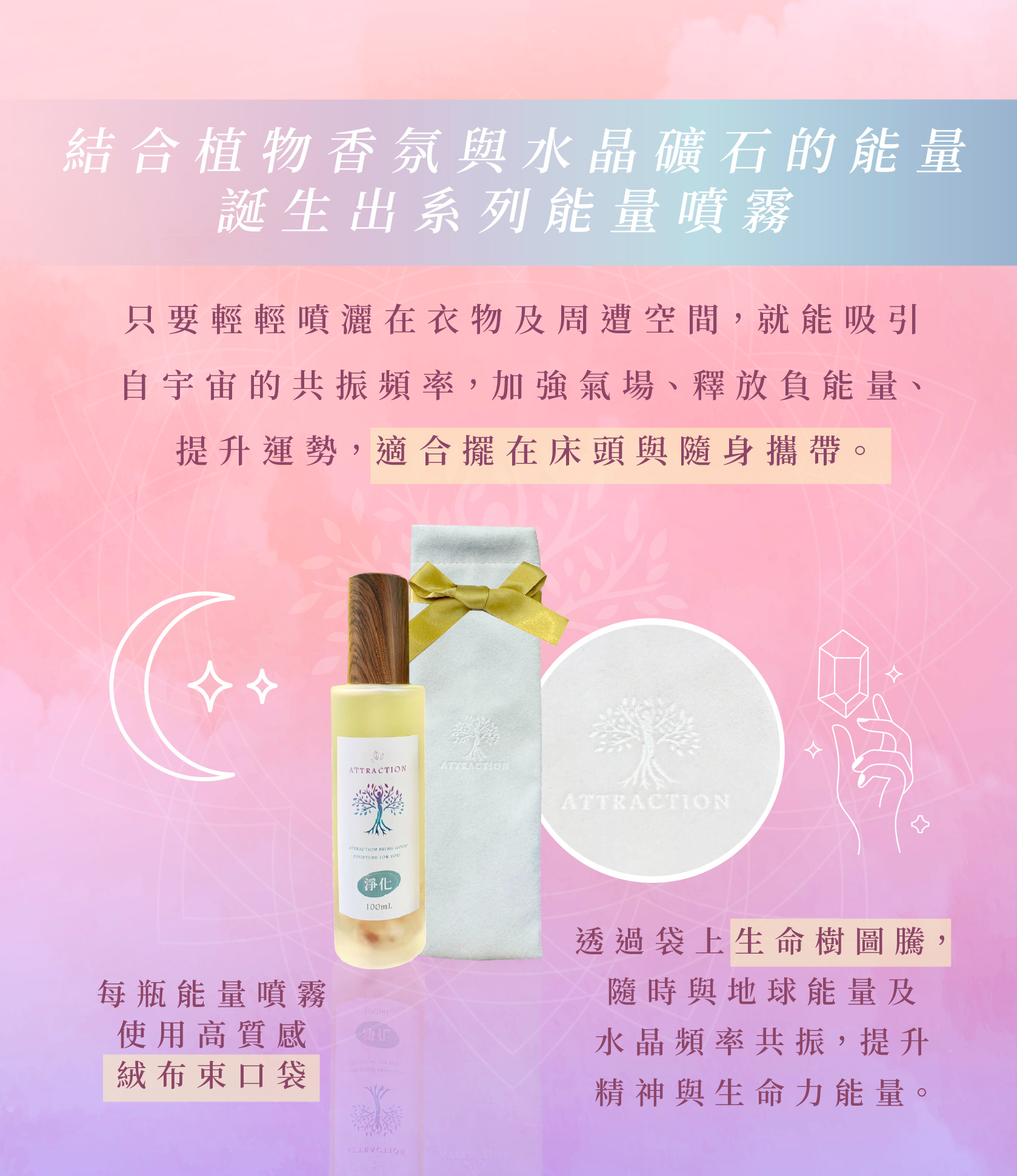 品牌名「Attraction吸引力」來自宇宙的吸引力法則。