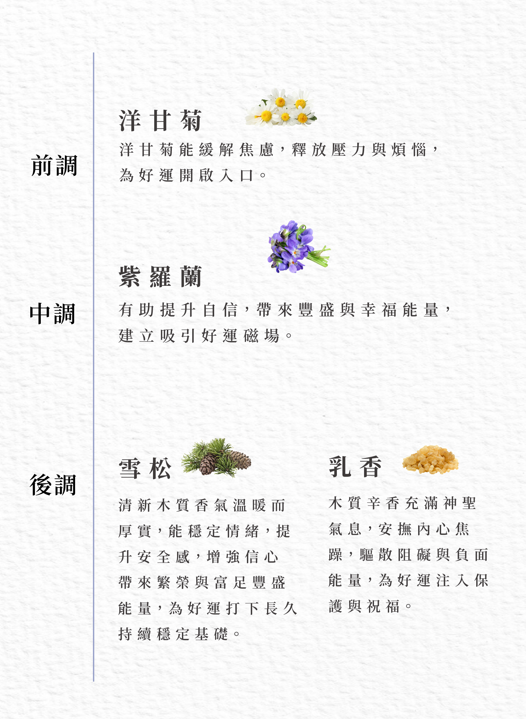 木質辛香充滿神聖氣息,安撫內心焦躁,驅散阻礙與負面能量,為好運注入保護與祝福。