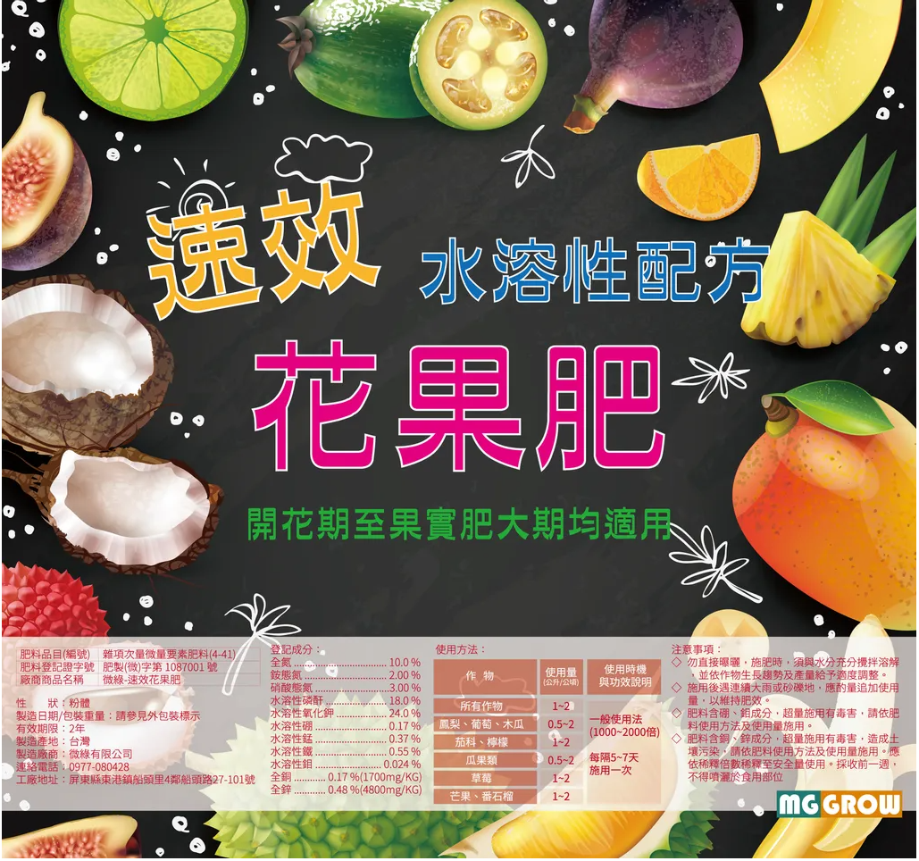 1.氮磷鉀比例專為花果期間而設計,適合於開花期至果實肥大期間使用。