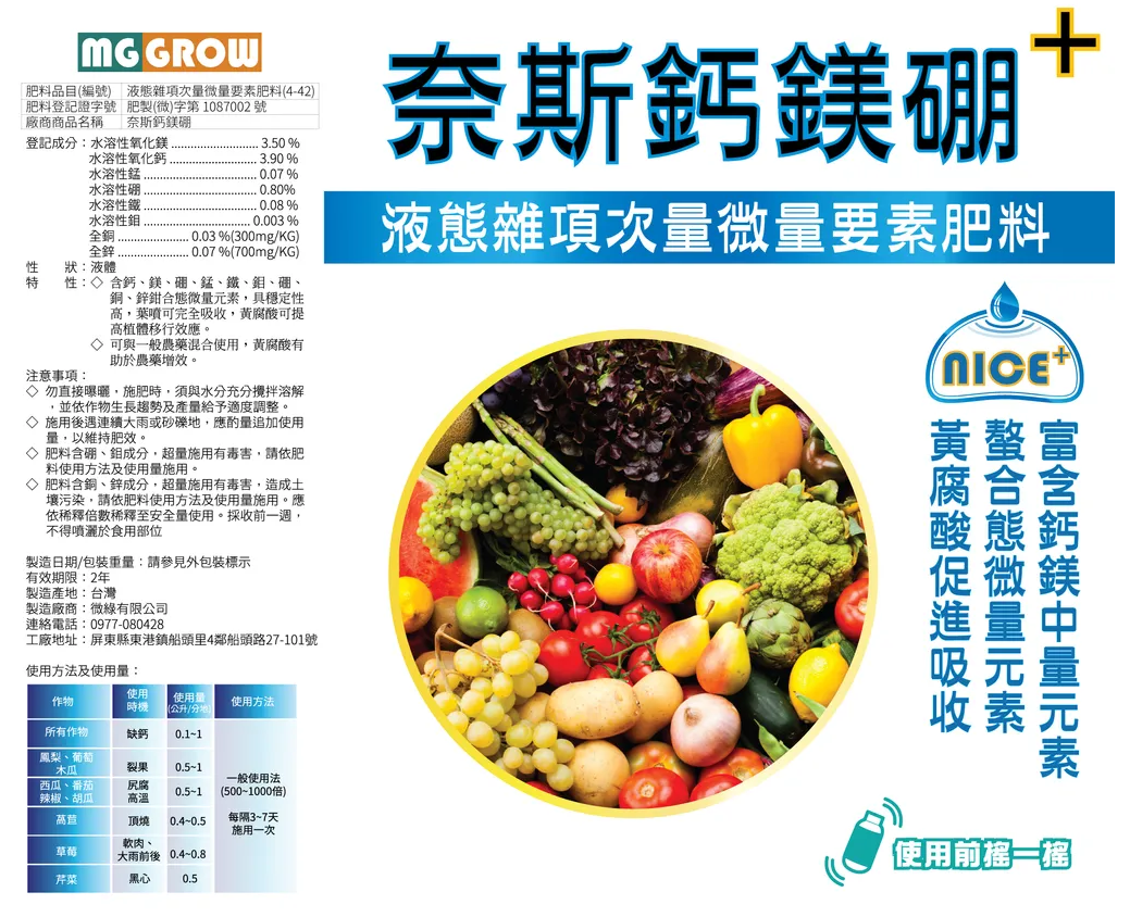 螯合微量元素:奈斯鈣鎂硼內含的微量元素(錳、硼、鐵、鉬、銅、鋅)