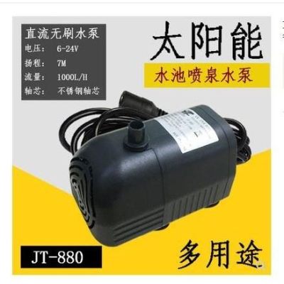 1.直流無刷潛水泵JT880,輸入電壓:DC6-24V 功率:2-50W。流量450L/H-1300L/H 揚程:80—700CM 。 泵體尺寸:直徑6CM.長度9.8CM 需要配24V4A電源的請直接拍就好了。我們提供的電源為24V4A DELL 筆記本開關電源。 如自備電源需滿足以下條件:電流不得小於2.5A(蓄電池、太陽能板除外)、電壓嚴禁超24V。 與JT680區別:體積更大,站的更穩,更適合做噴泉及需要大體積的儀器。 水泵規格:  工作電壓6-24(VDC) 進水口 出水口 注意 長98(MM) 寬60(mm) 高80(mm) 外徑(mm) 內徑(mm) 外徑10.1(mm) 內徑7 .9(mm) 不要空轉 3.電機繞組全封閉,採用配方獨特的樹脂灌封,絕緣性好,永不漏水。連續工作壽命至少20000小時。 4.水泵底部帶有4個軟吸盤,可隨意固定。 5.可以方便清洗,耐腐蝕,高效節能。 6.超靜音,10cm 噪音指數僅為30dB。此水泵為潛水泵,須放在水中工作。 7.主要用於太陽能工藝噴泉、設備冷卻、醫療、水族館等。水泵採用環保材料,產品通過ROSH/IP68/CE/EMC認證!產品保修1年!本廠可以根據客戶要求設計各種微型小水泵。 親們請注意:褐色為正極,藍色線為負極。因違規使用本產品或者私自拆解本產品造成的損失,本公司有權放棄售後服務!水泵為全密封,親們請不要拆.請使用規定範圍內的電壓!請勿使用熱水或者渾濁的水。 水泵僅是一個配件,一旦燒毀無法修復,因我們無法控制買家使用情況,除產品固件出現缺失外,水泵燒毀一律不予更換或者退貨。請知悉!不同意者請慎拍! 紋波問題(最容易出問題的地方):很多直流變壓器是半波整流,結果就是直流中參雜了很多交流成分,水泵必壞!無刷水泵必須是全波整流!不懂的請請教專業人士! 友情提醒:使用前不能確定自己電源電壓,請先測試! 特別注意:所有直流水泵,不能使用交流電源(家用的1100V電源路由器等交流輸出變壓器),嚴禁使用超過規定的直流電壓。不懂的使用前請諮詢。      無刷水泵對電壓特別敏感,水泵一經燒毀,責任自負,不同意者慎拍!那些交直流完全不分,電壓高低沒有概念又喜歡亂接而且燒壞了還喜歡責怪別人的,您可以關閉此頁面離開了 補充說明:  (1)本太陽能水泵屬於直噴式產品,要在有明顯陽光下才能噴水,不是在任何情況下都可以工作的。  (2)為了保證產品的正常工作和使用壽命,請注意在比較清潔的水中使用。   (3)不要在沒有水的情況下將水泵直接放置於陽光下。  (4)不要將水泵與其他供電設備連接 立即選用,為您的環保溫馨的家庭添加一個適用新型的太陽能產品!  特別注意:所有直流水泵,不能使用交流電源。更不能使用家用的110V電源,也包括超過規定的直流電壓。無刷水泵對電壓特別敏感,水泵一經燒毀,本公司不承擔任何後果,不同意者慎買! 水泵僅是一個配件,一旦燒毀無法修復,因我們無法控制買家使用情況,除產品固件出現缺失外,水泵損毀一律不予更換或者退貨。請知悉!不同意者請慎拍!