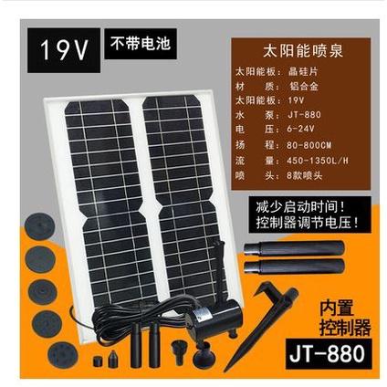 20W太陽能板 太陽能板有水泵穩壓器無刷馬達壽命會比較長 注意事項:太陽能板工作直接處於陽光下, 注意事項: 1本產品為太陽能直驅水泵,沒有外加蓄電池,噴水的高度完全取決於陽光的強弱,在陽光弱的時候,水泵不會連續工作,但會自動的反复啟動,直至陽光達到一定強度後水泵恢復連續工作狀態。使用時請將產品放置於無遮擋的陽光下,有陰影遮擋會影響水泵正常工作。需要蓄電或者蓄電帶LED燈的請選用本公司其他型號的產品。 2水泵必須完全浸入水中,不可長時間脫水工作。當水泵剛浸入水中時,由於水泵裡面有空氣,建議等水泵正常噴水後在插入噴頭。 3請保持水源清潔,定期清洗水泵,防止異物被水泵吸入而導致水泵不能正常工作。 注意:太陽能噴泉跟太陽光強度密切相關,陰天或陽光較弱時可能不會工作或者噴水較低,不理解的請不要拍,謝謝!