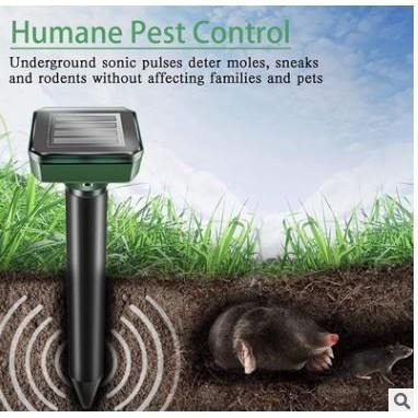 使利用聲波來擊退有害囓齒類動物,(老鼠,蚊子, 田鼠等) 太陽能驅鼠器通過發射聲波,驅趕地下囓齒類動物非常有效。聲波會刺激他們,模擬危險,在輻射面積內驅逐它們。太陽能驅鼠器每30秒左右發射一次聲波,在650平方米內有效。 太陽能驅鼠器輻射四面八方。不受任何阻礙,讓聲波的排放量自如。為了使產品的最佳使用效果,我們強烈建議在每個隔5-8米安裝一個驅鼠器。 太陽能驅鼠器電池是太陽能可充電儲蓄電池。當蓄電池充滿電後,可以在夜晚供應足夠的電力,從而保證了持續整晚運作。 技術數據: 能充電。 請注意: 首先,在使用之前檢查地面。凍土,地面淹水灌溉不適合使用。挖一個坑,把驅鼠器放進去。土壤的密度將極大地影響了裝置的效果。土壤越密集,驅鼠效果越高。 安裝時勿用錘子。 無需用力安裝,否則設備被損壞。 插入接地棒,要注意不要過度用力,以免妨設備被損壞,或者碰撞。