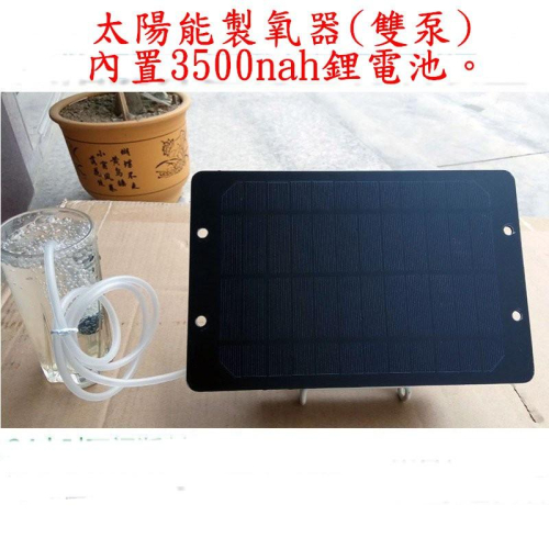 太陽能板尺寸:270*175mm 太陽能板:6V6W全新單晶 (3500mah電池款) 防水級別:IP65(可長期致於戶外無憂) 軟管長度:3米 氧氣泵額定功率:1.5W 排氣量:1.0L/min 氣壓:0.17Mpa 出氧口:3mm 適用環境:-10-55攝氏度 使用壽命:超過5年 無開關曬太陽使用一面工作,一面蓄電。太陽下山後還可以使用。