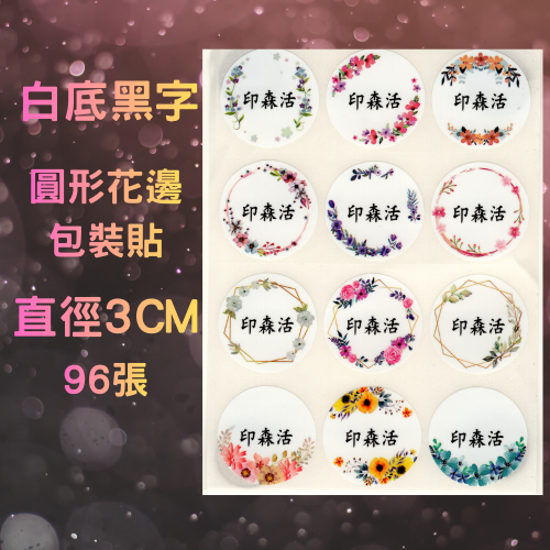 印森活】白底黑字圓形花邊包裝貼 96張 / 尺寸直徑3cm|卡通姓名貼 版權貼 大張姓名貼 可愛姓名貼