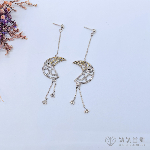❤️筑筑首飾❤️鑲黃白鑽月亮造型流蘇吊墬耳環