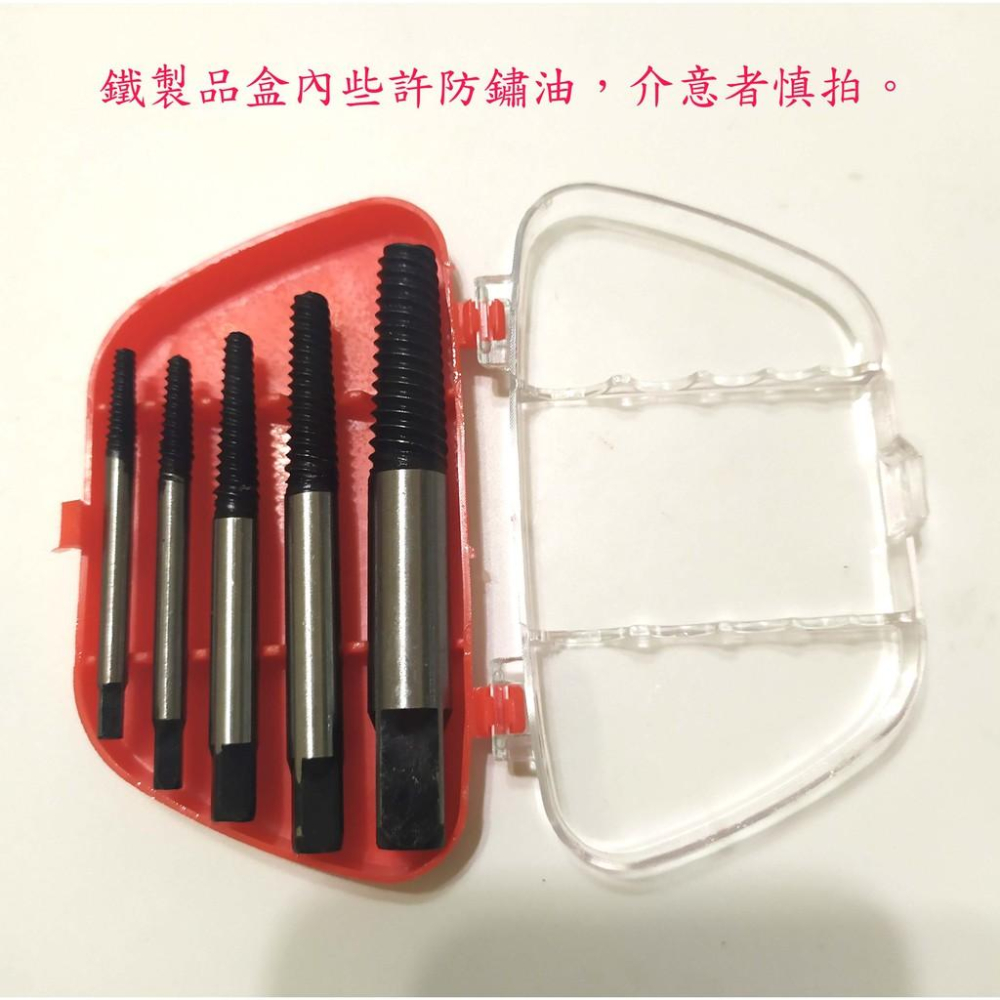 給沒使用過的建議 這類工具使用起來,有一定難度 建議多找相關影片或多爬文 商品名稱:滑牙螺絲取出器 功能:拆卸已損壞的斷頭螺絲 規格:1#,2#,3#,4# ,5# 取出範圍: 適合M3—M18螺絲 包裝:塑盒 使用說明: 配合電鑽使用或手動工具使用 建議配合電動工具用會比較好操作 使用原理: 利用斷絲取出器的反方向螺紋,當逆時針轉動時,斷絲取出器往內孔越旋越緊,一定緊度時螺絲跟著轉動,就會轉出來了。