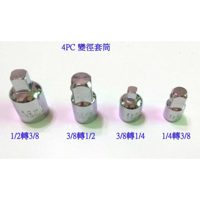 商品名稱:套筒轉換頭 變徑套筒 1/2“轉3/8"__4分轉3分 3/8"轉1/4"__3分轉2分 3/8"轉1/2"__3分轉4分 1/4"轉3/8"__2分轉3分 一組4顆120元