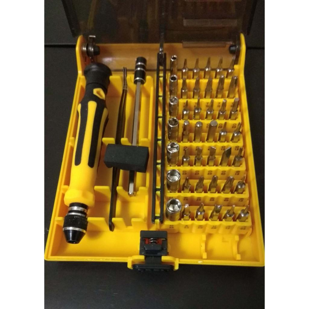 產品特點: 專業便攜的設計,實用性高 帶有延長桿可以被插入到手柄的長度調 材質:高鉻/釩鋼 45PCS ,1個的橡膠把手(約11.5厘米),1個延長桿 (12.0厘米的),1個金屬手柄(約11.9厘米) 螺絲起子柄旋轉帽 汽車的工作和電腦維修及其他電子維修 能打開手機,電腦,筆記本電腦,PDA外殼,PSP,NDS,MP3播放器等