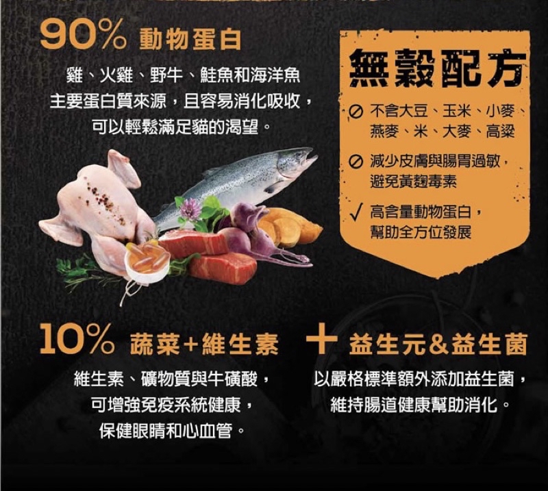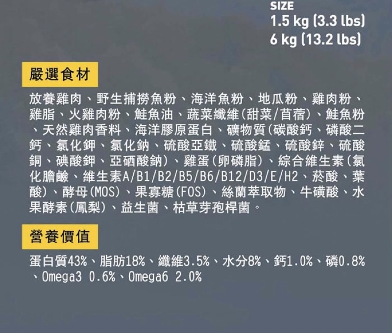 放養鮮雞肉,脫水野生魚肉,脫水海洋魚肉,紅薯粉,脫水雞肉,雞脂,脫水火雞肉,鮭魚油(與生育酚混合保存),植物纖維(甜菜和苜蓿),脫水鮭魚肉,天然雞肉香精 ,海洋膠原蛋白,礦物質(碳酸鈣,磷酸氫鈣,氯化鉀,氯化鈉,硫酸亞鐵,硫酸錳,硫酸鋅,硫酸銅,碘化鉀,亞硒酸鈉),全蛋(卵磷脂),維生素(氯化膽鹼,A, B1,B2,B5,B6,B12,D3,E,H2,菸酸,葉酸),酵母(MOS),FOS(低聚果糖),絲蘭提取物,牛磺酸,水果酵素(鳳梨),益生菌-枯草芽孢桿菌。