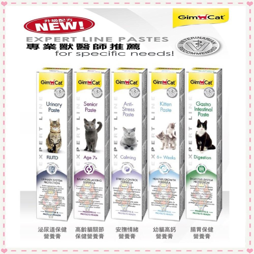 🐱泌尿道保健營養膏 🐱《特色說明》 專業獸醫推薦,適用泌尿道功能弱 高效配方有助泌尿道保健,無添加糖類、乳糖、人工色素、防腐劑,嗜口性佳。 🐱主成份:蔬菜衍生物、植物油、植物脂肪、酵母、軟體動物及甲殼類動物(葡萄胺0.42) 🐱營養分析 : 粗蛋白5.5%,粗脂肪34.0%,粗灰分4.5%,粗纖維1.5%,分12.5% 🐱保證分析(每kg含量) : L-色氨酸1250m 抗氧化劑 🐱容量:50g/條 🐱適用對象:全齡貓 🐱產地:德國 🐱使用說明:6周以上開始餵食固體食物的幼貓,每天6cm(1cm約0.5g),可直接餵食或混入食物中。 https://s-cf-tw.shopeesz.com/file/tw-11134208-7r990-lwdx4ws2qfcgd5 🐱益生菌腸胃保健營養膏 🐱《特色說明》 專業獸醫推薦,消化道系統保健配方 維持腸道健康,保護腸胃道黏膜,並增進腸內菌叢平衡。 GimCat貓用胃腸保健營養膏含有高質量的活性複合物成分,有助於飲食消化。   🐱提供胃腸道天然保護: •腸道保健 •調整細菌叢生態 •適用消化機能弱 •幫助維持消化道機能  🐱主成份:植物衍生物(洋車前子、榆樹皮)、油脂、脂肪、酵母、草粉、乳糖衍生物  🐱營養分析:蛋白質5.5%、脂肪34%、粗灰分5.5%、粗纖維2.0%、水份12%  🐱容量:50g/條 🐱適用對象:全齡貓 🐱產地:德國 🐱使用說明:6周以上開始餵食固體食物的幼貓,每天6cm(1cm約0.5g),可直接餵食或混入食物中。 https://s-cf-tw.shopeesz.com/file/tw-11134208-7r98w-lwdx4ws2rtwwe3 🐱安撫情緒營養膏 🐱《特色說明》 專業獸醫推薦,適用於有攻擊性、情緒暴躁 減少因心情影響而做出不愉快行為 壓力會導致貓有不愉快的行為,例如: 對家具,門框和沙發過度劃刮傷。 貓的壓力及所導致的問題行為最常見原因是:訪問獸醫,新的家庭,度假旅行,翻新/搬家,或由於家中或外在環境的改變所造成的直接影響。  🐱GimCat 貓用安撫情緒營養膏含有舒緩壓力並使心情放鬆的重要成分: •Eschscholzia有助於鎮定並舒緩焦慮作用 •聖約翰草有溫和的安撫情緒作用 •L-色氨酸: 釋放""快樂激素""的血清素 •β-葡聚醣: 可舒緩貓咪壓力  🐱主成份:植物衍生物、植物油、植物脂肪、魚肉、魚肉衍生物、聖約翰草0.04%、酵母(含1% β-葡聚醣)、花菱草0.7%   🐱保證分析:粗蛋白 7.0%、粗脂肪35.0%、粗灰分 6.0%、粗纖維 2.0%、水份 12.0%  🐱營養分析(每公斤含量):維生素E 1,125毫克、維生素B1 133毫克、維生素B2 100毫克、維生素B6 67毫克、維生素B12 467微克、牛磺酸 1,500毫克、L-色氨酸 12500毫克  🐱容量:50g/條 🐱適用對象:全齡貓 🐱產地:德國 🐱使用說明:6周以上開始餵食固體食物的幼貓,每天6cm(1cm約0.5g),可直接餵食或混入食物中。 https://s-cf-tw.shopeesz.com/file/tw-11134208-7r98w-lwdx4ws2t8hc09 🐱高齡貓關節保健營養膏 🐱《特色說明》 專業獸醫推薦,7歲以上、關節退化適用 與人類或狗相比,貓的老化跡象不太明顯,但7歲以上的高齡貓代謝過程開始有變化,且會有越來越多與年齡有關的問題產生,包括體重不足等。提供所需營養能夠維持貓咪健康及生活品質。 🐱GimCat 高齡貓營養膏含有高質量的活性複合物成分,以預防與年齡有關的問題產生。 •皮膚保健 •關節保養 •舒緩壓力  🐱主成份:植物衍生物、油脂、脂肪、魚肉、魚肉衍生物、酵母、軟體動物、甲殼類 動物 (葡萄糖胺)  🐱保證分析:蛋白質9.0%、脂肪36.5%、粗灰分1.5%、粗纖維6.0%、水份13%  🐱營養分析(每公斤含量):維生素B1 133毫克、維生素B2 100毫克、維生素B6 67毫克、維生素B12 467微克、左旋肉鹼 5,000毫克、L-色氨酸(含抗氧化劑) 12500毫克  🐱容量:50g/條 🐱適用對象:全齡貓 🐱產地:德國 🐱使用說明:6周以上開始餵食固體食物的幼貓,每天6cm(1cm約0.5g),可直接餵食或混入食物中。 https://s-cf-tw.shopeesz.com/file/tw-11134208-7r990-lwdx4ws2un1s91 🐱幼貓高鈣營養膏 🐱《特色說明》 專業獸醫推薦,幼貓健康生長配方   特別針對6周以上幼貓所需大量蛋白質、維生素和礦物質設計配方。幫助幼貓健康成長、牙齒骨骼正常發育,及維持免疫力。 •完美的鈣磷比例,幫助生長、骨骼和牙齒形成。 •添加12種維生素和微量營養素:特別適合幼貓營養需求,能維持免疫力。 •亞麻籽油和魚油:富含omega-3、脂肪酸和omega-6脂肪酸,可保護細胞。 •牛磺酸:貓關鍵營養素,確保其視力及心臟保健。 提供幼貓所需Arachidonic Acid(花生四烯酸),為貓不可或缺且無法在體內自己合成的一種脂肪,僅能在動物身體組織,肝臟,及蛋黃内找到。 🐱主成份:植物衍生物、油脂、脂肪(魚油,亞麻籽油)、酵母、魚肉、魚肉衍生物、藻類   🐱保證分析:蛋白質7.0%、脂肪35.5%、粗灰分10.5%、粗纖維2.0%、水份12%、鈣 2.0%、磷1.0%  🐱營養分析(每公斤含量):維生素D3 573 IU、維生素E 1,580毫克、維生素K 1毫克、維生素B1 13毫克、維生素B2 10毫克、維生素B6 7毫克、維生素B12 47微克、維生素C 50毫克、生物素 900微克、菸鹼酸(維生素B3) 469毫克、葉酸 9毫克、D-泛酸钙 75毫克、牛磺酸 2,000毫克  🐱容量:50g/條 🐱適用對象:幼貓 🐱產地:德國 🐱使用說明:6周以上開始餵食固體食物的幼貓,每天6cm(1cm約0.5g),可直接餵食或混入食物中。 https://s-cf-tw.shopeesz.com/file/tw-11134208-7r991-lwdx4ws2w1m85f