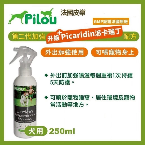 #Pilou ● 產品成份 活性成份:派卡瑞丁(Picardin) ,香葉醇(來自天竺葵),香茅,香茅油,杏仁油 ● 強大優勢 1. 可噴於寵物窩、地墊、居家環境等處 ● 使用方式 一週使用1~2次。使用前請搖一搖,瓶身保持垂直噴灑,距離寵物約20 ~ 30cm使用,噴灑時請抖鬆毛髮,讓噴劑能深至皮膚,從尾部開始逆毛噴灑,快速移動,包括頭部,腹部及腿部內側。 確認全身都已經噴灑適量,必要時請重覆此動作。 ◎天然.適合各年齡層犬及懷孕哺乳母犬皆可使用。(建議三個月以上使用)