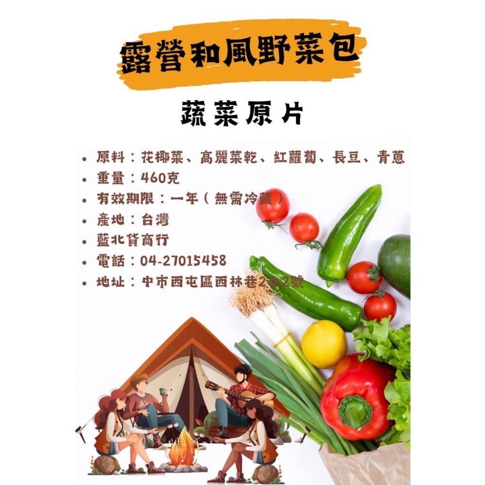 露營專用蔬菜包 露營和風野菜包 原料:花椰菜,高麗菜乾,紅蘿蔔,長豆,青蔥 重量:460克 有效期限:一年(無需冷藏) 產地:台灣 ★可長期保存★ 工廠直營、歡迎批發