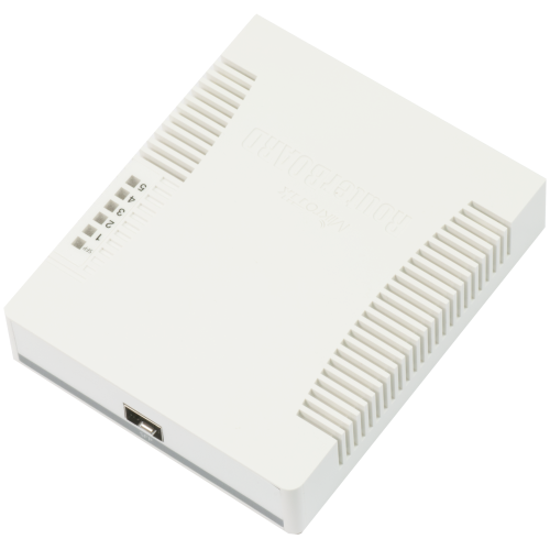 The RB260GS is a small SOHO switch. It has five Gigabit Ethernet ports and one SFP cage powered by an Atheros Switch Chip.