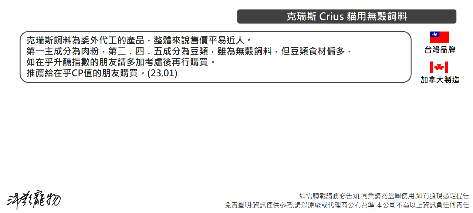 沛茲寵物【克瑞斯 Crius 貓用無穀飼料 1lb】無穀 風乾肉塊 加拿大 貓飼料 貓 飼料