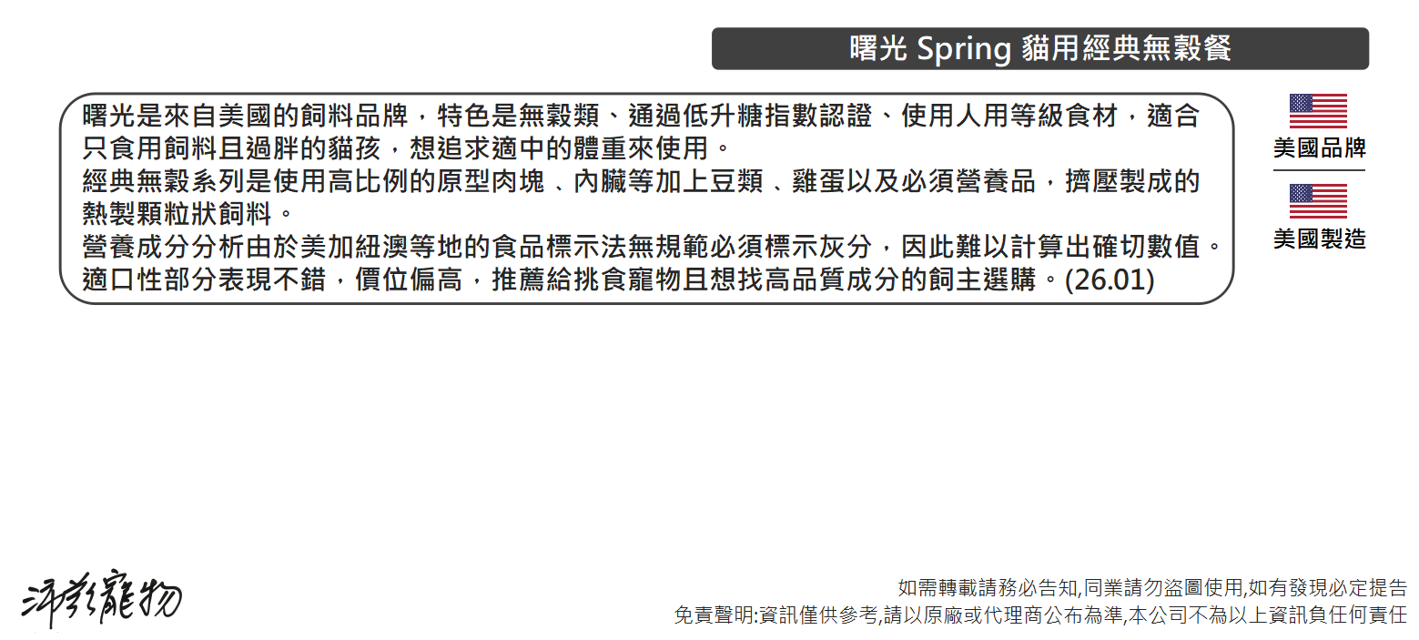 沛茲寵物【曙光 Spring 貓用經典無穀寵物餐 300g】無穀 天然糧 美國 主食 貓飼料 貓 飼料
