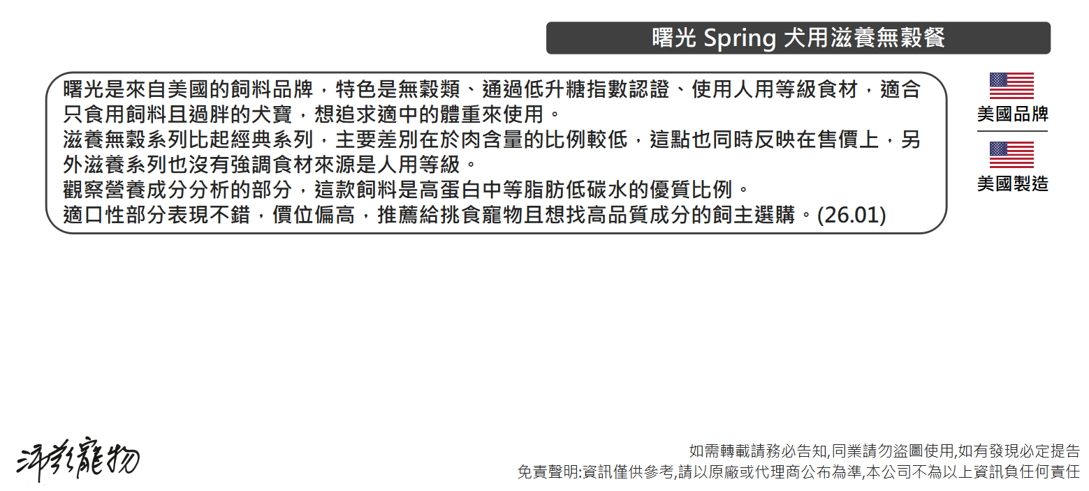 沛茲寵物【曙光 Spring 犬用滋養無穀餐 300g】無穀 滋養 天然糧 美國 主食 狗飼料 狗 飼料