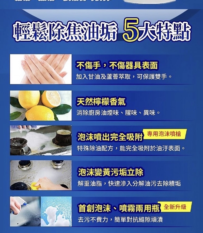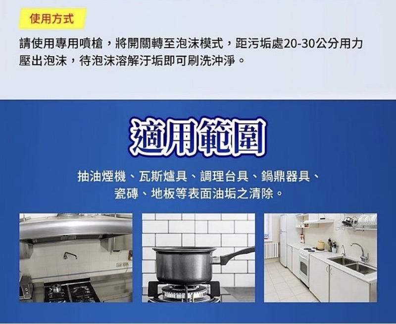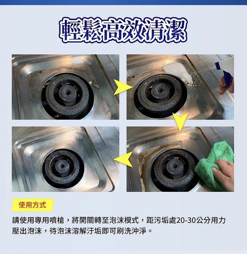 * 有特殊泡沫配方搭配高效網狀噴頭設計,能完全吸附於油汙表面不滑落,效果快又省。
