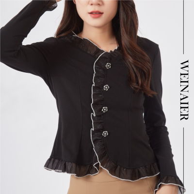 【薇奈爾】荷葉邊收腰法式溫柔淑女風長袖上衣