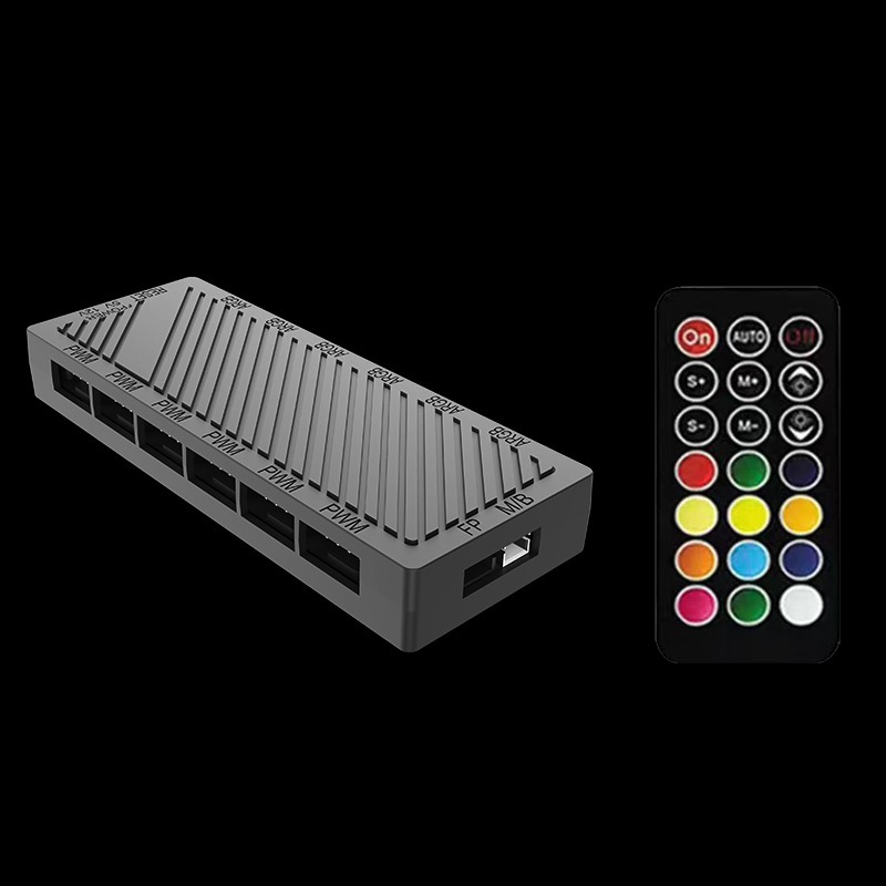 M7燈光控制盒提供6口PWM風扇接口、6口5V燈光接口,並有SATA獨立供電,簡化線材管理。配備遙控器,可調整燈光顏色和效果。