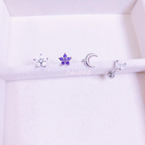 此款鎖珠是1.2MM的針 一般正常版型的粗細噢 圖片款式依序為:白鑽小花、紫鑽小花、月亮、小葉子。 材質: 醫療鋼 鎖珠單支售