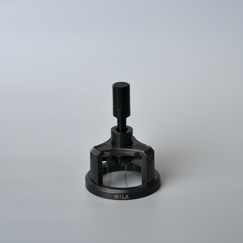 • 透過多支細針穿插咖啡粉層,打散結塊,讓粉層內部更均勻。