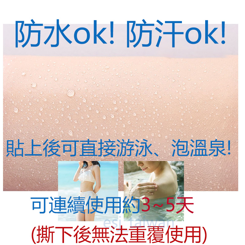防水性、防汗性強所以貼合後可以直接去泡溫泉或游泳~ 產品本身有強力的附著力所以就算流汗也不易脫落,每片貼上後,可以連續貼約3~5天左右(撕下後無法重複使用)。