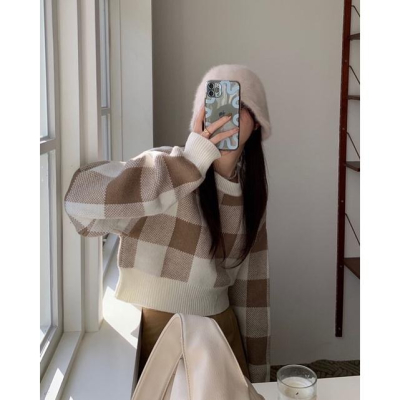 𝐔𝐌𝐄𝐎𝐖 𝐒𝐓𝐔𝐃𝐈𝐎 奶奶咖 格子短版寬鬆針織毛衣