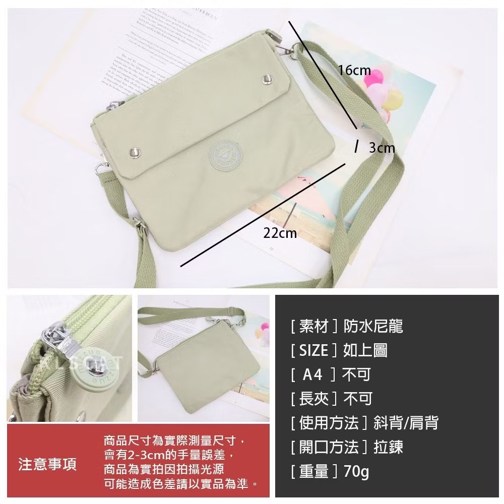 MIZZUE韓版防潑水尼龍三層橫式拉鏈手提斜背包輕巧小包手提包側背包肩背包手機包化妝包 PL889 KLSCAT