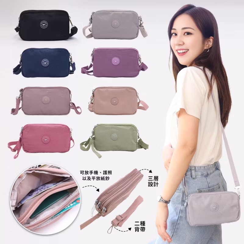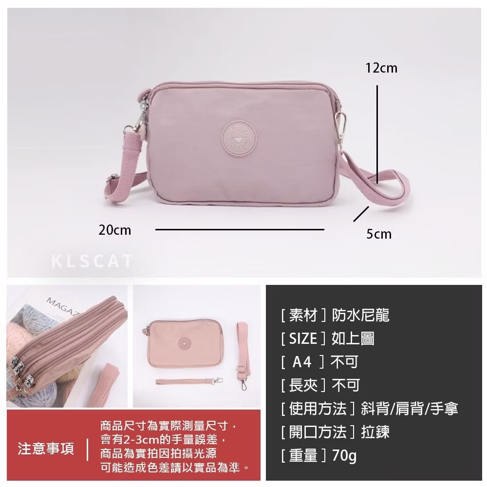MIZZUE 防潑水尼龍三層拉鏈手提斜背包 輕巧 三層 手提包側背包肩背包 手機包化妝包PL890 KLSCA