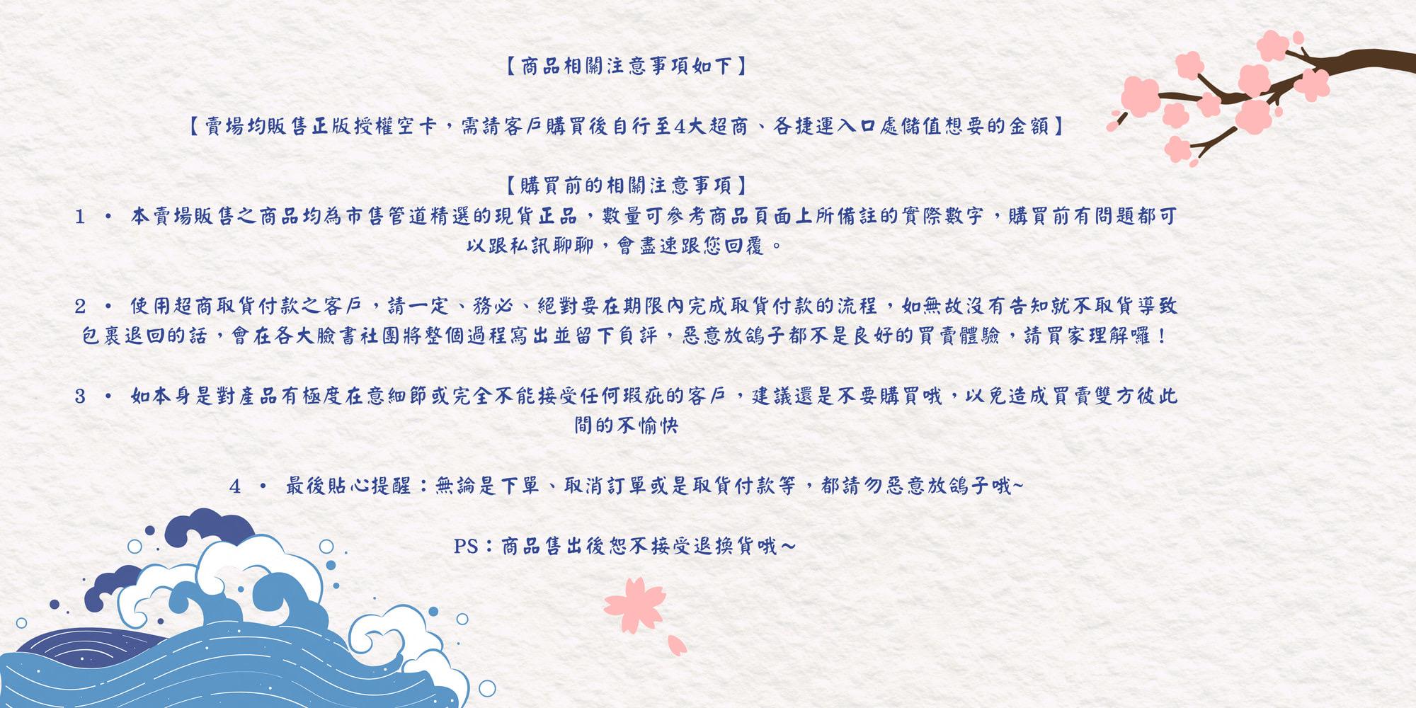 <p class="p1" style="margin-bottom:0px;font-size:17px;line-height:normal;color:rgb(0,0,0);"><span class="s1" style="font-family:UICTFontTextStyleBody;"><b>【商品相關注意事項如下】</b></span></p><p class="p2" style="margin-bottom:0px;font-size:17px;line-height:normal;min-height:22px;color:rgb(0,0,0);"><b><span class="s1" style="font-family:UICTFontTextStyleBody;"></span><br /></b></p><p class="p1" style="margin-bottom:0px;font-size:17px;line-height:normal;color:rgb(0,0,0);"><span class="s1" style="font-family:UICTFontTextStyleBody;"><b>【賣場均販售正版授權空卡,需請客戶購買後自行至4大超商、各捷運入口處儲值想要的金額】</b></span></p><p class="p1" style="margin-bottom:0px;font-size:17px;line-height:normal;color:rgb(0,0,0);"><span class="s1" style="font-family:UICTFontTextStyleBody;"><b><br />【購買前的相關注意事項】</b></span></p><p class="p1" style="margin-bottom:0px;font-size:17px;line-height:normal;color:rgb(0,0,0);"><span class="s1" style="font-family:UICTFontTextStyleBody;"><b>1 • 本賣場販售之商品均為市售管道精選的現貨正品,數量可參考商品頁面上所備註的實際數字,購買前有問題都可以跟私訊聊聊,會盡速跟您回覆。</b></span></p><p class="p1" style="margin-bottom:0px;font-size:17px;line-height:normal;color:rgb(0,0,0);"><span class="s1" style="font-family:UICTFontTextStyleBody;"><b><br /></b></span></p><p class="p1" style="margin-bottom:0px;font-size:17px;line-height:normal;color:rgb(0,0,0);"><span class="s1" style="font-family:UICTFontTextStyleBody;"><b>2 • 使用超商取貨付款之客戶,請一定、務必、絕對要在期限內完成取貨付款的流程,如無故沒有告知就不取貨導致包裹退回的話,會在各大臉書社團將整個過程寫出並留下負評,惡意放鴿子都不是良好的買賣體驗,請買家理解囉!<br /></b></span></p><p class="p2" style="margin-bottom:0px;font-size:17px;line-height:normal;min-height:22px;color:rgb(0,0,0);"><b><span class="s1" style="font-family:UICTFontTextStyleBody;"></span><br /></b></p><p class="p1" style="margin-bottom:0px;font-size:17px;line-height:normal;color:rgb(0,0,0);"><span class="s1" style="font-family:UICTFontTextStyleBody;"><b>3 • 如本身是對產品有極度在意細節或完全不能接受任何瑕疵的客戶,建議還是不要購買哦,以免造成買賣雙方彼此間的不愉快</b></span></p><p class="p1" style="margin-bottom:0px;font-size:17px;line-height:normal;color:rgb(0,0,0);"><span class="s1" style="font-family:UICTFontTextStyleBody;"><b><br /></b></span></p><p class="p1" style="margin-bottom:0px;font-size:17px;line-height:normal;color:rgb(0,0,0);"><span class="s1" style="font-family:UICTFontTextStyleBody;"><b>4 • 最後貼心提醒:無論是下單、取消訂單或是取貨付款等,都請勿惡意放鴿子哦~</b></span></p><p class="p2" style="margin-bottom:0px;font-size:17px;line-height:normal;min-height:22px;color:rgb(0,0,0);"><b><br /><span class="s1" style="font-family:UICTFontTextStyleBody;"></span></b></p><p class="p1" style="margin-bottom:0px;font-size:17px;line-height:normal;color:rgb(0,0,0);"><b><span class="s1" style="font-family:UICTFontTextStyleBody;">PS:商品售出後恕不接受退換貨哦~</span><span style="font-size:18px;"></span></b></p>