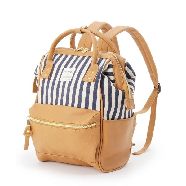 日貨特價-日本樂天大開口皮革上班上學日用包後背包 小尺寸A4可 藍條紋加駝色