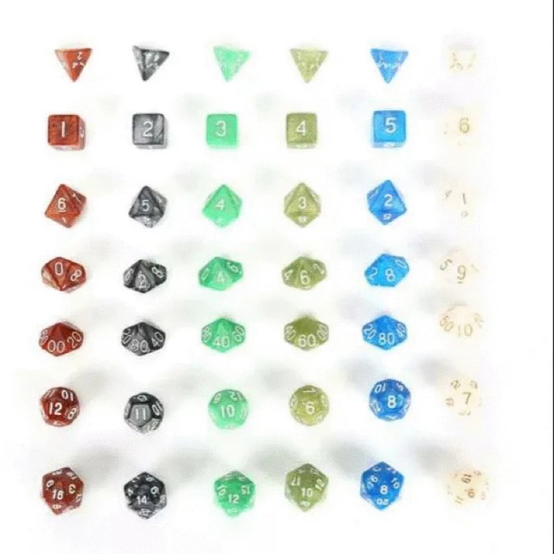 •內含4面、6面、8面、10面、12面、20面及10位數面骰等共 7 顆骰子。