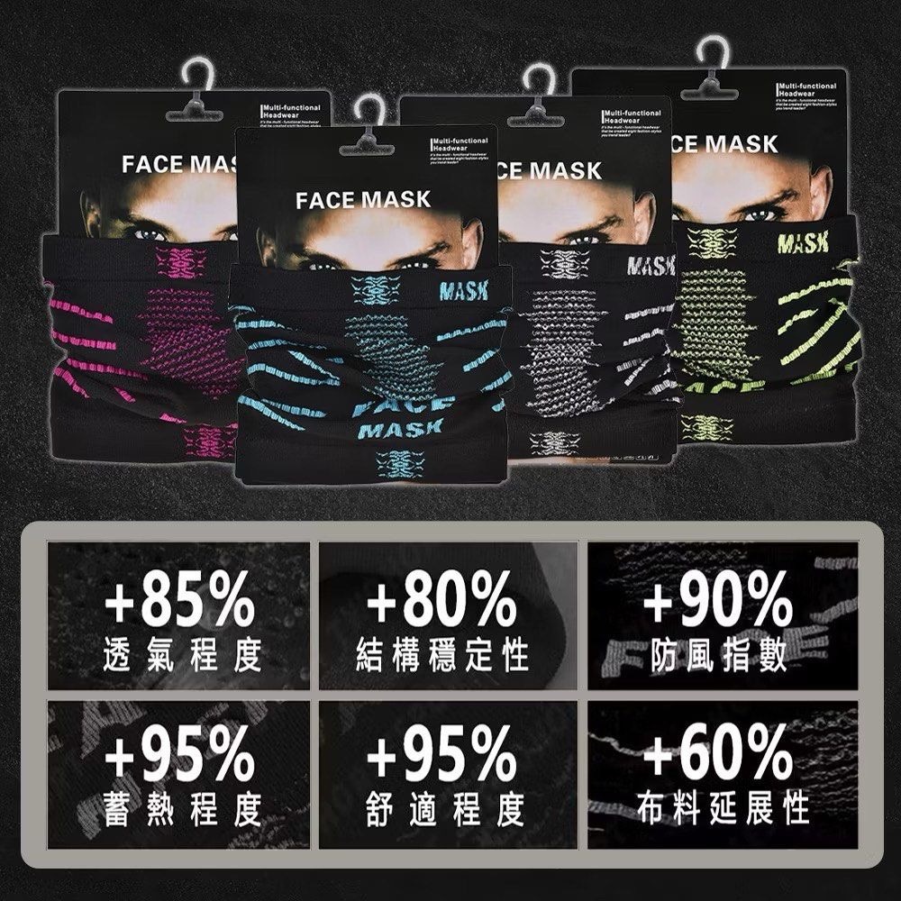 - 彈性極佳,貼合舒適,高彈性材質適合各種臉型,穩定貼合不滑落,活動中也不影響視野。