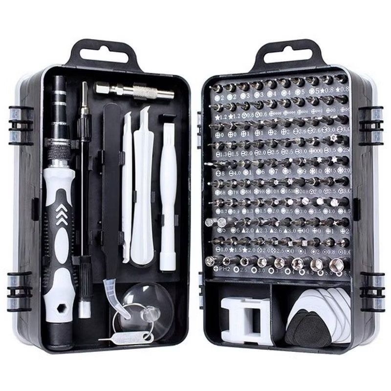 •超值115件組合,應對各種維修需求,內含多種螺絲起子頭、撬棒、吸盤等,適用於手機、筆電、相機等電子設備維修。