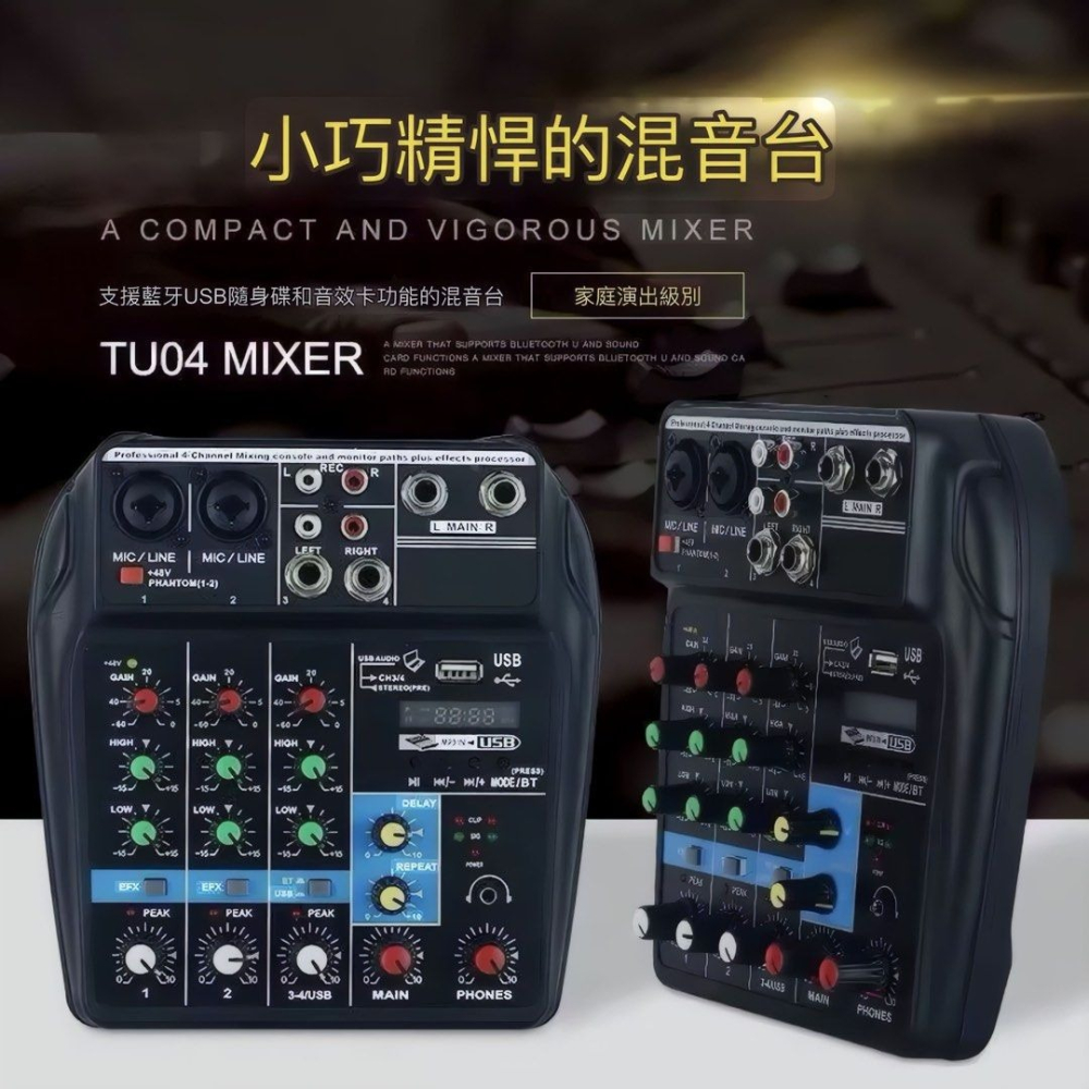 •調音台是具有聲卡的多功能4通道調音台,可以滿足家庭音樂製作,網路廣播,K歌曲和其他需求。