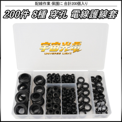 【商品說明/產品特色】 ■ 設置內容:[安裝孔直徑/數量] ・3mm/40個  ・5mm/40個  ・6mm/40個  ・8mm/30個 ・10mm/20個  ・12mm/10個  ・16mm/10個  ・20mm/10個 【適用於】 可用於各式維修……等等。 【出貨明細】 200個 開孔 橡膠護線套 盒裝 *1 【尺寸】 請參考賣場尺寸圖 (人工測量皆有些許誤差,完美主義者請勿下單) ▲注意 商品圖檔顏色因電腦螢幕設定差異略有不同,以實際商品顏色為準 包裝略有些許改款,已實際出貨為準,無法接受者請勿下標。 商品如有極輕度刮傷或些許污漬,無法接受者請勿下標 人工點閱數量正負3%為正常現象 塑料成形時略有些許毛邊變形屬正常現象